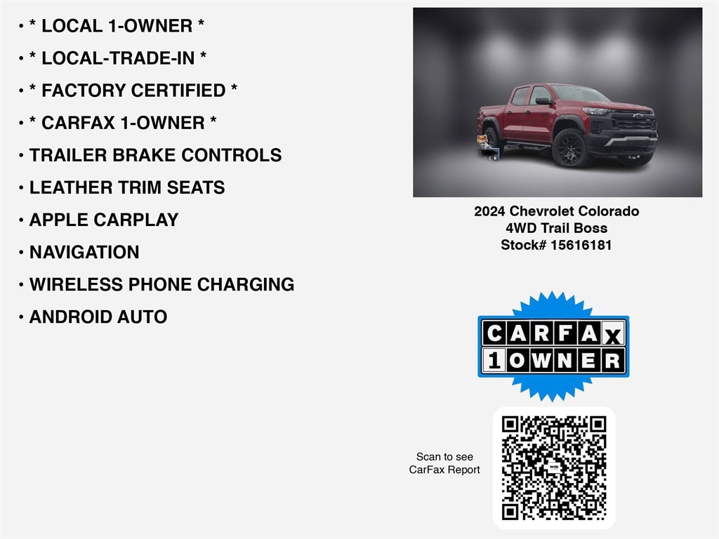 2024 Chevrolet Colorado Trail Boss Radiant Red Tintcoat CARFAX One-Owner. Certified. *** GM CERTIFIED PRE-OWNED ***, 4WD, Advanced Trailering Package, AM/FM radio: SiriusXM, Apple CarPlay/Android Auto, Electronic Automatic Cruise Control, Heavy-Duty Trailering Package, Manual Rear-Sliding Window, Rear-Window Electric Defogger, Steering Wheel Mounted Audio Controls, Trail Boss Convenience Package, Trailering App.
