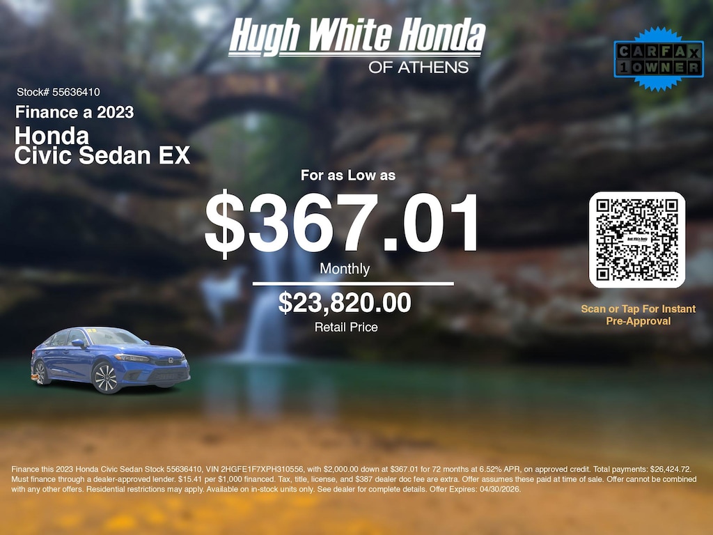 If you're ready to finance a Honda Certified used car near Athens, Nelsonville, Logan, and Parkersburg, Hugh White Honda of Athens is thrilled to offer you a competitive finance offer on this 2023 Honda Civic Sedan EX. Use our car payment calculator to estimate your car payment, or see how the monthly payment of $367.01 is calculated for well-qualified buyers shopping at Hugh White Honda of Athens with Tier 1 credit: