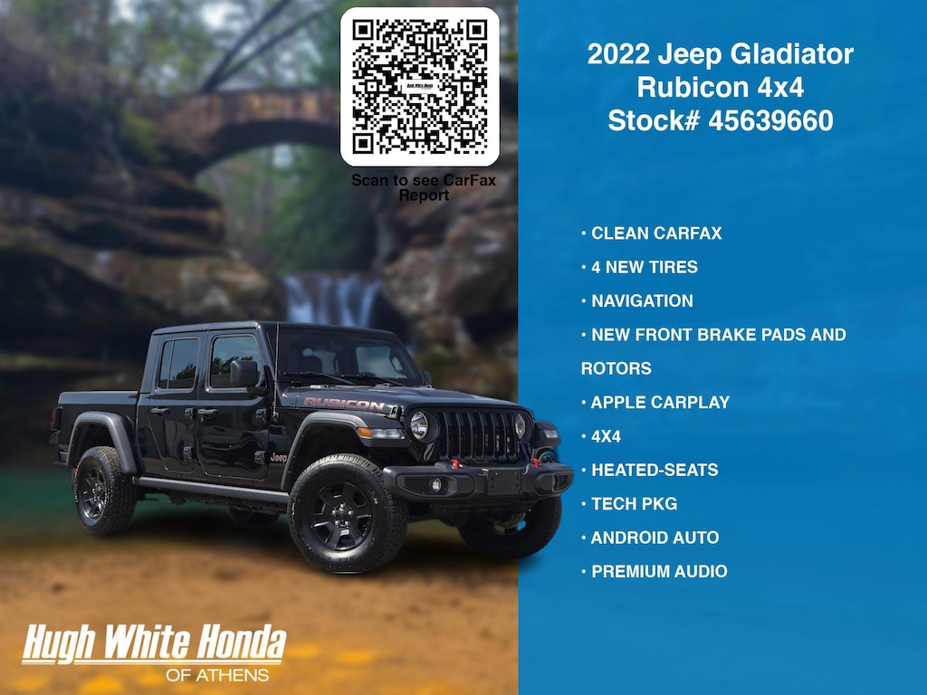 (844) 859-8630 TO SCHEDULE YOUR TEST DRIVE of this 2022 Jeep Gladiator Rubicon 4x4. You can also visit us at 250 Columbus Road. Athens, OH 45701 to check it out in person! Our Hugh White Athens Used car dealership only sells used cars Athens, OH buyers can trust for safety and worry free driving.