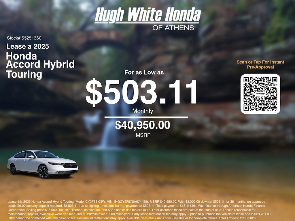 Disclaimer: Lease this 2025 Honda Accord Hybrid Touring (Model CY2F8SKNW; VIN 1HGCY2F87SA074450). MSRP $40,950.00. With $3,000.00 down at $503.11 for 36 months, on approved credit. $0.00 security deposit required. $3,503.11 due at signing - includes 1st mo. payment of $503.11. Total payments: $18,111.96. Must finance through American Honda Finance Corporation. Selling price $38,950. Tax, title, license, destination, and $387 dealer doc fee are extra. Offer assumes these are paid at the time of sale. Lessee responsible for maintenance, repairs, excessive wear and tear, and $0.20/mile over 12000 miles/year. Early lease termination fee may apply. Option to purchase the vehicle at lease end is $23,751.00. Offer cannot be combined with any other offers. Residential restrictions may apply. Available on in-stock units only. See dealer for complete details. Offer Expires: 11/03/2025.