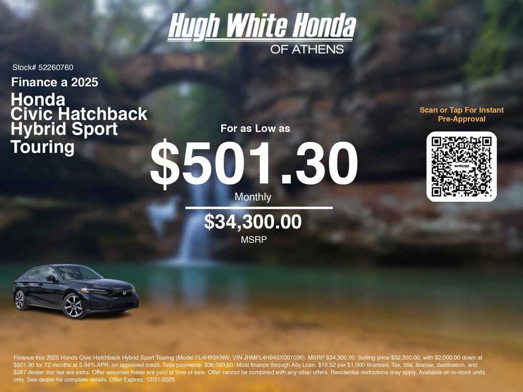 If you're ready to finance a new Honda near Athens, Nelsonville, Logan, and Parkersburg, Hugh White Honda of Athens is thrilled to offer you a competitive finance offer on this 2025 Honda Civic Hatchback Hybrid Sport Touring. Hereâs how the monthly payment of $501.30 is calculated for well qualified buyers shopping Hugh White Honda of Athens with Tier 1 credit: