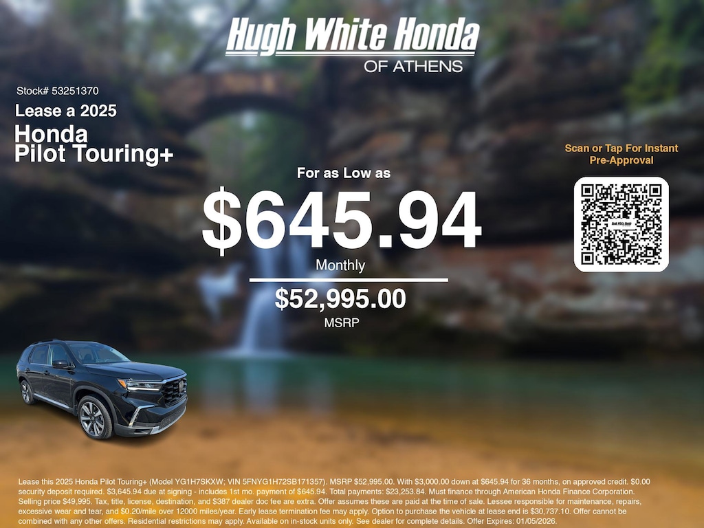 Disclaimer: Lease this 2025 Honda Pilot Touring+ (Model YG1H7SKXW; VIN 5FNYG1H72SB171357). MSRP $52,995.00. With $3,000.00 down at $645.94 for 36 months, on approved credit. $0.00 security deposit required. $3,645.94 due at signing - includes 1st mo. payment of $645.94. Total payments: $23,253.84. Must finance through American Honda Finance Corporation. Selling price $49,995. Tax, title, license, destination, and $387 dealer doc fee are extra. Offer assumes these are paid at the time of sale. Lessee responsible for maintenance, repairs, excessive wear and tear, and $0.20/mile over 12000 miles/year. Early lease termination fee may apply. Option to purchase the vehicle at lease end is $30,737.10. Offer cannot be combined with any other offers. Residential restrictions may apply. Available on in-stock units only. See dealer for complete details. Offer Expires: 01/05/2026.