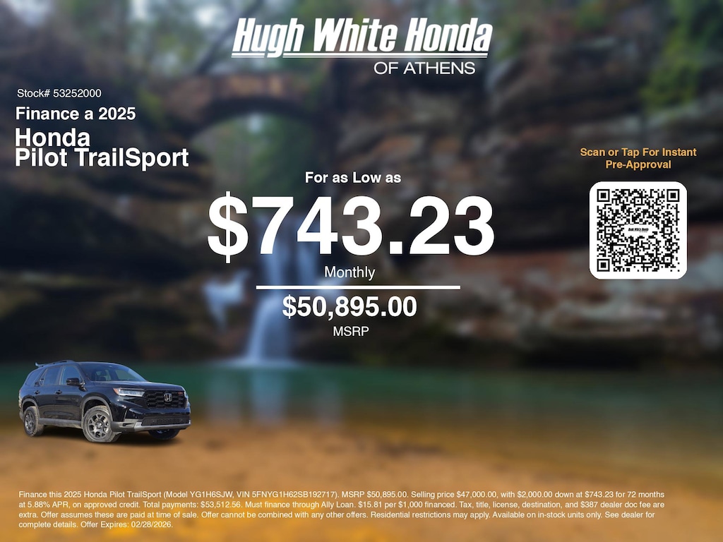 Calculate car payment options using our car monthly payment calculator to explore this and other Honda finance offers that leverage the benefits of Honda Financial Services, along with current Honda Pilot TrailSport specials and incentives available. Our car payment estimator can help you budget for your perfect vehicle. Plus, we have 4 other Pilot TrailSport options for Athens's best selection. Call or visit us today to discuss car payment options that allow you to drive home this stunning 2025 Honda Pilot, with finance options available near Athens. These Honda finance specials end 2/28/2026