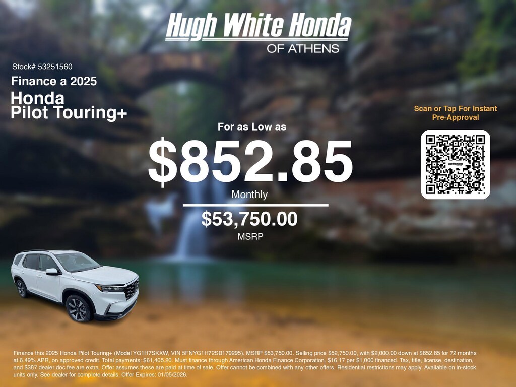 If you're ready to finance a new Honda near Athens, Nelsonville, Logan, and Parkersburg, Hugh White Honda of Athens is thrilled to offer you a competitive finance offer on this 2025 Honda Pilot Touring+. Hereâs how the monthly payment of $852.85 is calculated for well qualified buyers shopping Hugh White Honda of Athens with Tier 1 credit: