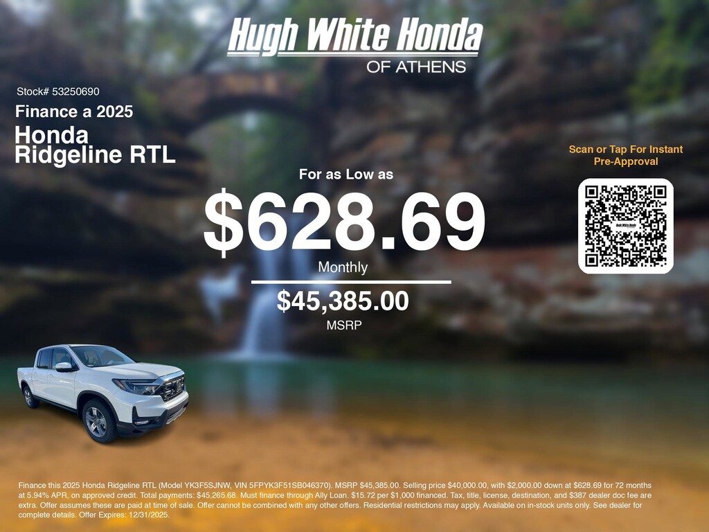 If you're ready to finance a new Honda near Athens, Nelsonville, Logan, and Parkersburg, Hugh White Honda of Athens is thrilled to offer you a competitive finance offer on this 2025 Honda Ridgeline RTL. Hereâs how the monthly payment of $628.69 is calculated for well qualified buyers shopping Hugh White Honda of Athens with Tier 1 credit: