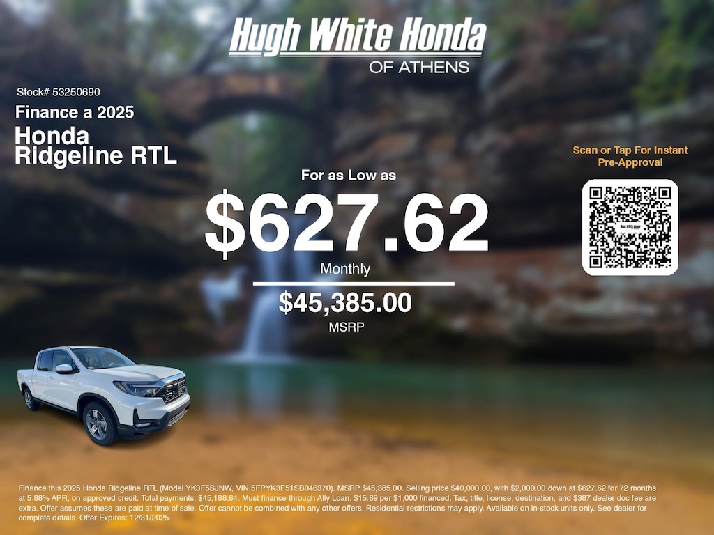 If you're ready to finance a new Honda near Athens, Nelsonville, Logan, and Parkersburg, Hugh White Honda of Athens is thrilled to offer you a competitive finance offer on this 2025 Honda Ridgeline RTL. Hereâs how the monthly payment of $627.62 is calculated for well qualified buyers shopping Hugh White Honda of Athens with Tier 1 credit: