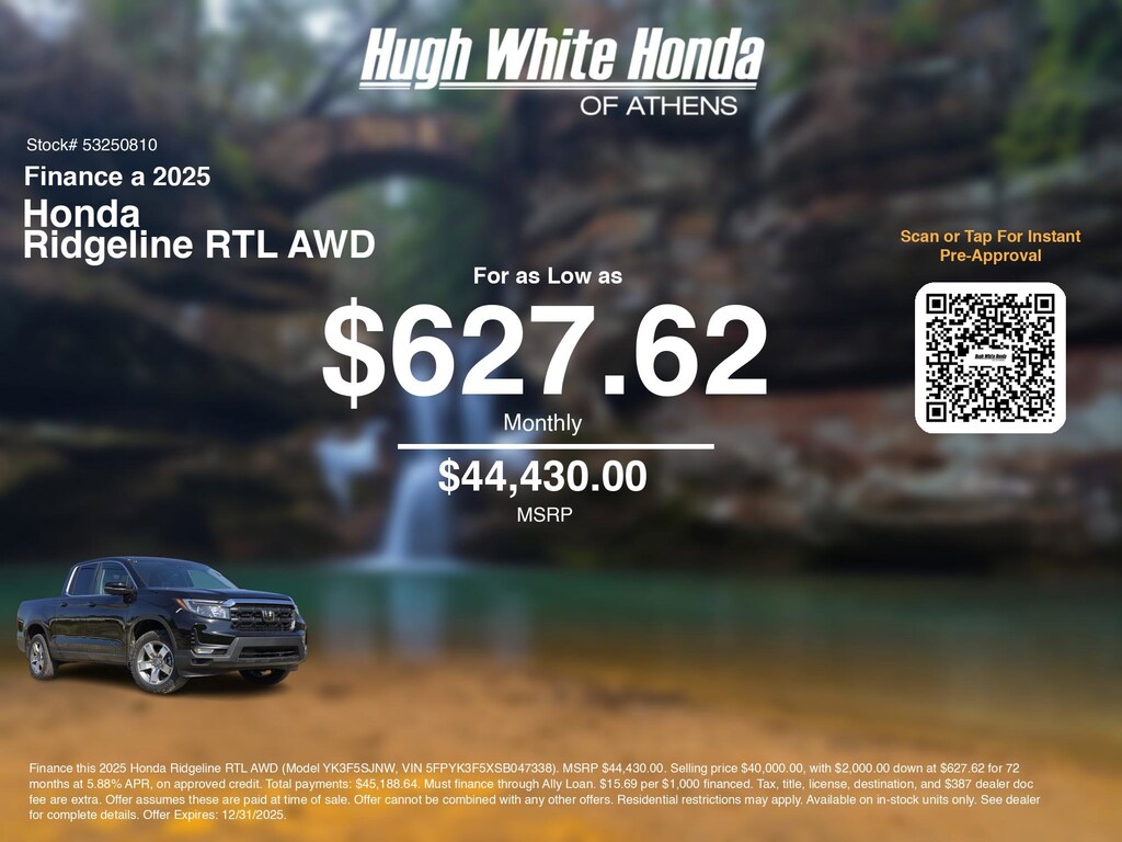 Disclaimer: Finance this 2025 Honda Ridgeline RTL AWD (Model YK3F5SJNW, VIN 5FPYK3F5XSB047338). MSRP $44,430.00. Selling price $40,000.00, with $2,000.00 down at $627.62 for 72 months at 5.88% APR, on approved credit. Total payments: $45,188.64. Must finance through Ally Loan. $15.69 per $1,000 financed. Tax, title, license, destination, and $387 dealer doc fee are extra. Offer assumes these are paid at time of sale. Offer cannot be combined with any other offers. Residential restrictions may apply. Available on in-stock units only. See dealer for complete details. Offer Expires: 12/31/2025.