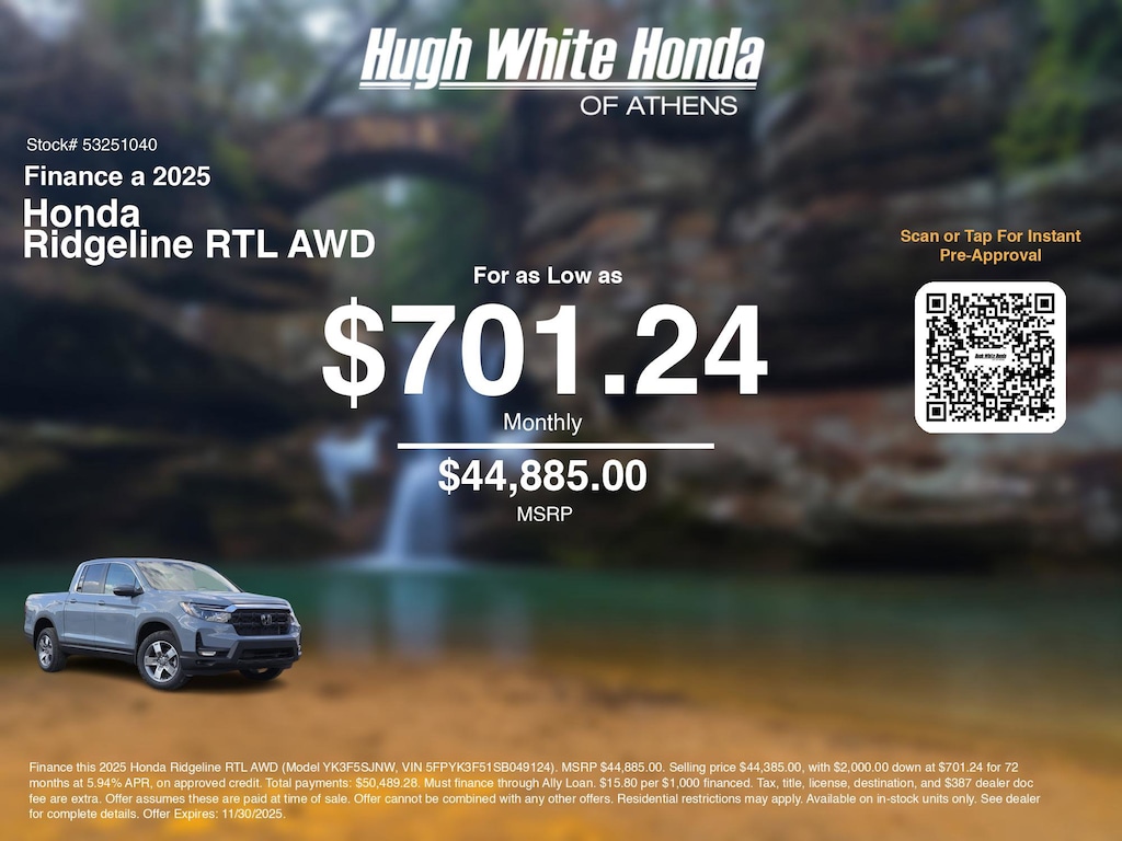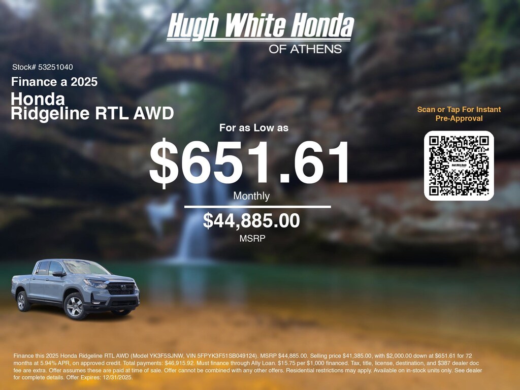 If you're ready to finance a new Honda near Athens, Nelsonville, Logan, and Parkersburg, Hugh White Honda of Athens is thrilled to offer you a competitive finance offer on this 2025 Honda Ridgeline RTL AWD. Hereâs how the monthly payment of $651.61 is calculated for well qualified buyers shopping Hugh White Honda of Athens with Tier 1 credit: