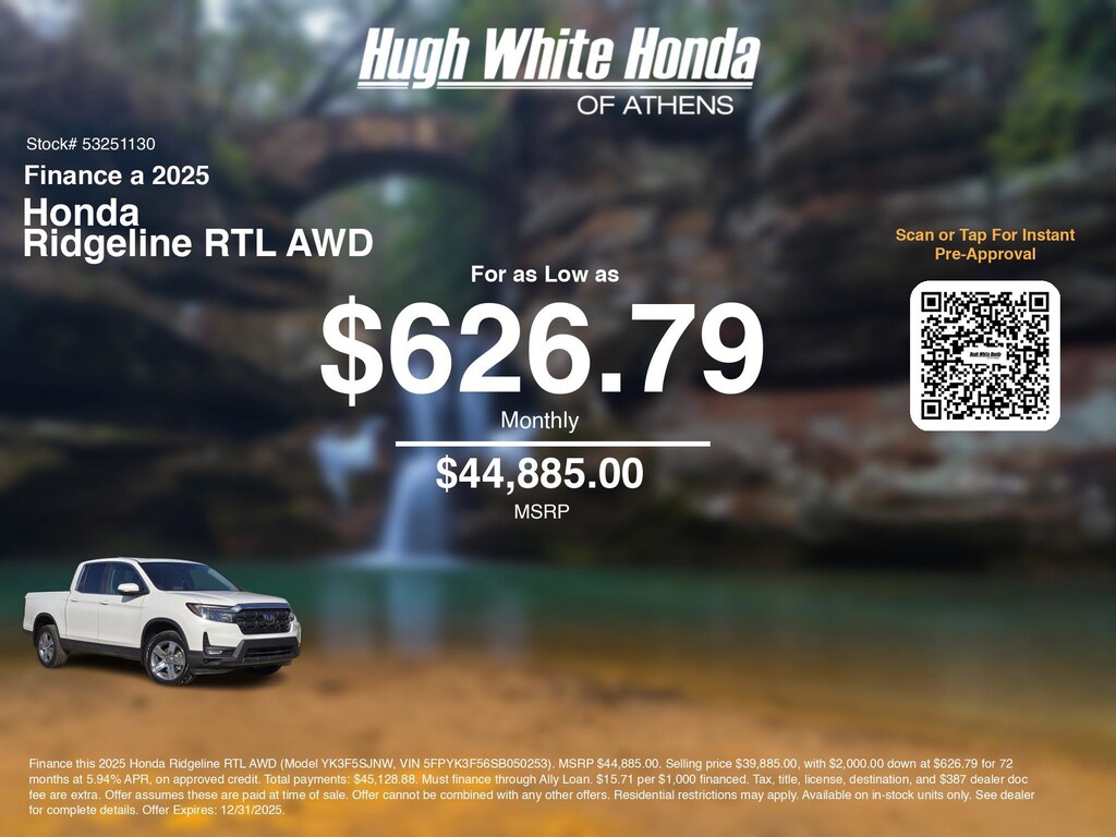 If you're ready to finance a new Honda near Athens, Nelsonville, Logan, and Parkersburg, Hugh White Honda of Athens is thrilled to offer you a competitive finance offer on this 2025 Honda Ridgeline RTL AWD. Hereâs how the monthly payment of $626.79 is calculated for well qualified buyers shopping Hugh White Honda of Athens with Tier 1 credit: