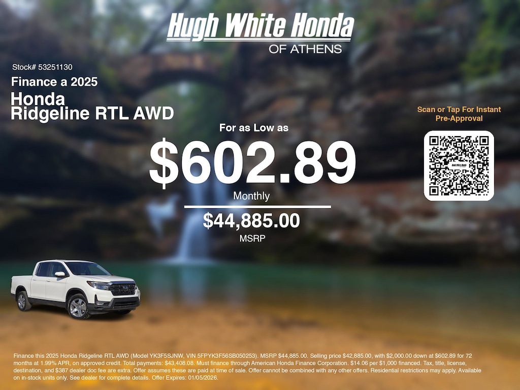 If you're ready to finance a new Honda near Athens, Nelsonville, Logan, and Parkersburg, Hugh White Honda of Athens is thrilled to offer you a competitive finance offer on this 2025 Honda Ridgeline RTL AWD. Hereâs how the monthly payment of $602.89 is calculated for well qualified buyers shopping Hugh White Honda of Athens with Tier 1 credit: