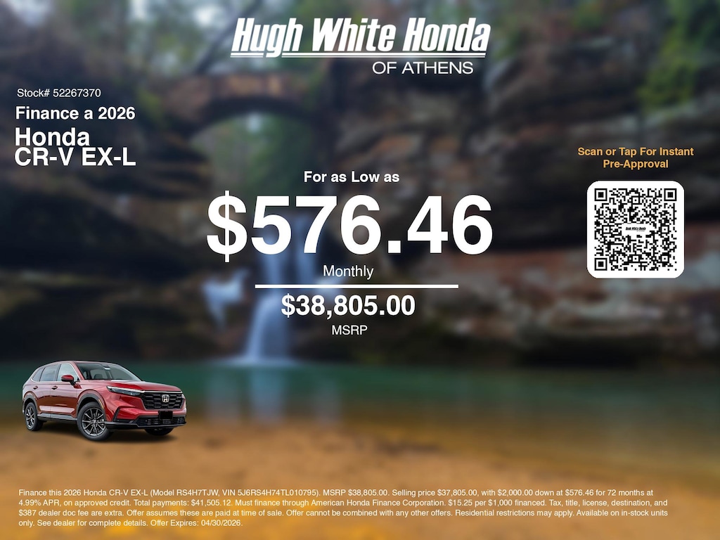 Disclaimer: Finance this 2026 Honda CR-V EX-L (Model RS4H7TJW, VIN 5J6RS4H74TL010795). MSRP $38,805.00. Selling price $37,805.00, with $2,000.00 down at $576.46 for 72 months at 4.99% APR, on approved credit. Total payments: $41,505.12. Must finance through American Honda Finance Corporation. $15.25 per $1,000 financed. Tax, title, license, destination, and $387 dealer doc fee are extra. Offer assumes these are paid at time of sale. Offer cannot be combined with any other offers. Residential restrictions may apply. Available on in-stock units only. See dealer for complete details. Offer Expires: 04/30/2026.