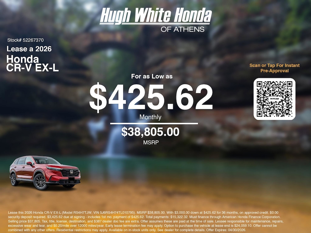 If you're ready to lease a new Honda near Athens, Nelsonville, Logan, and Parkersburg, Hugh White Honda of Athens is thrilled to offer you a competitive lease offer on this 2026 Honda CR-V EX-L. Here is how the monthly payment of $425.62 is calculated for well qualified buyers shopping Hugh White Honda of Athens with Tier 1 credit: