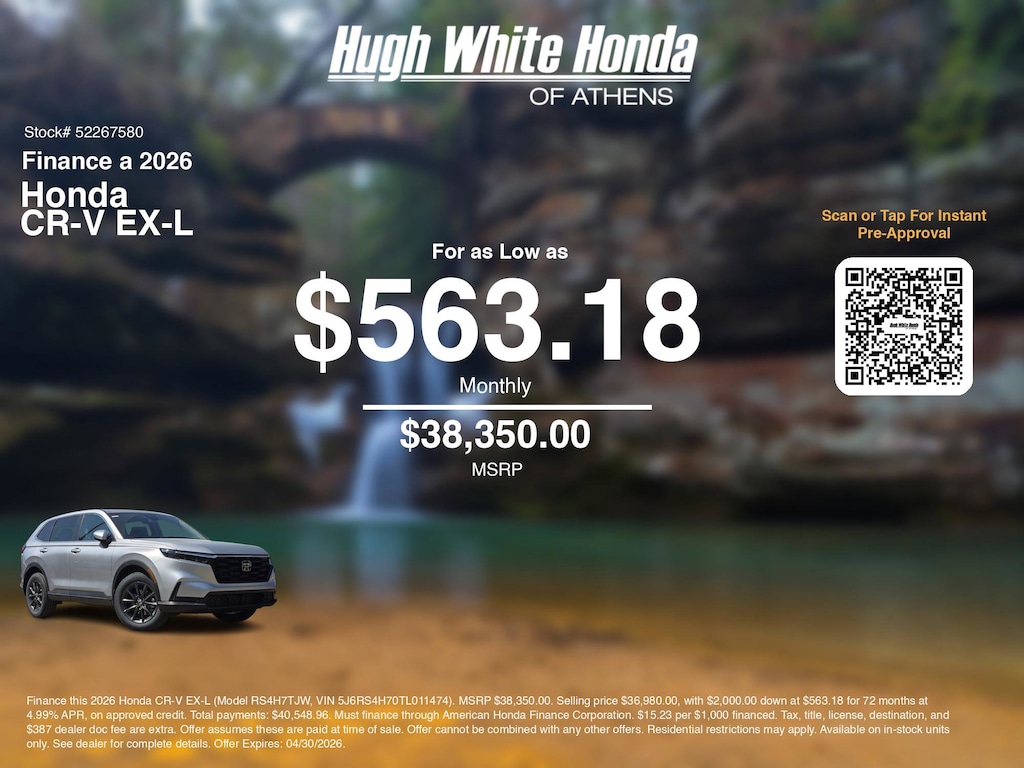 Disclaimer: Finance this 2026 Honda CR-V EX-L (Model RS4H7TJW, VIN 5J6RS4H70TL011474). MSRP $38,350.00. Selling price $36,980.00, with $2,000.00 down at $563.18 for 72 months at 4.99% APR, on approved credit. Total payments: $40,548.96. Must finance through American Honda Finance Corporation. $15.23 per $1,000 financed. Tax, title, license, destination, and $387 dealer doc fee are extra. Offer assumes these are paid at time of sale. Offer cannot be combined with any other offers. Residential restrictions may apply. Available on in-stock units only. See dealer for complete details. Offer Expires: 04/30/2026.