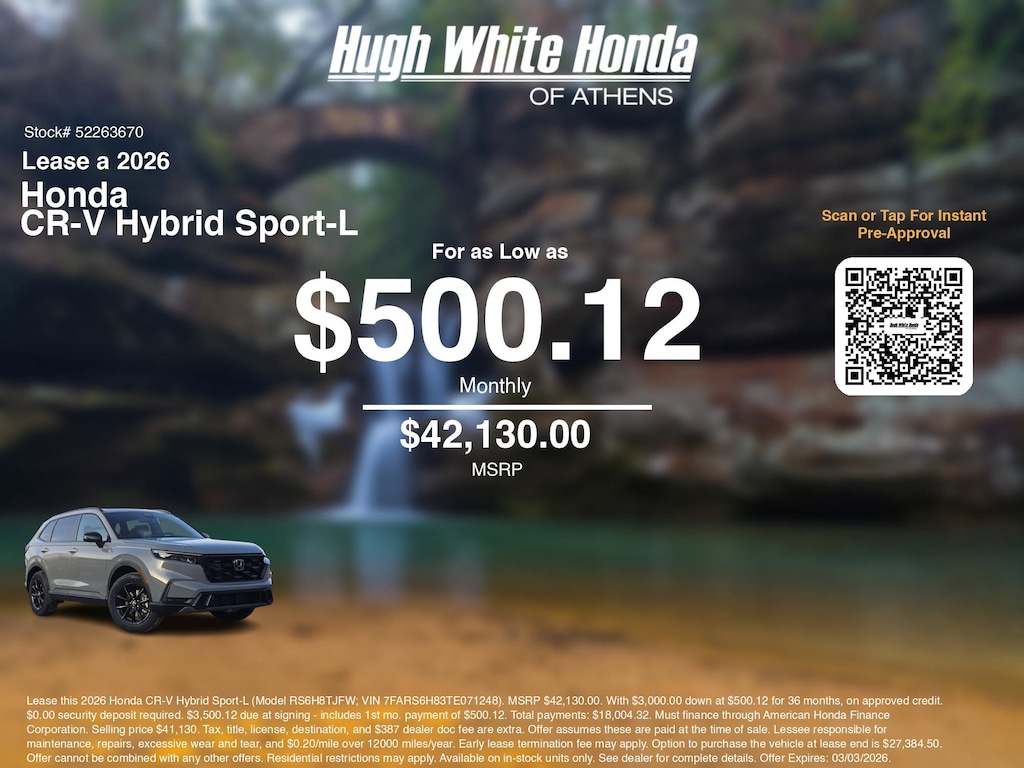Disclaimer: Lease this 2026 Honda CR-V Hybrid Sport-L (Model RS6H8TJFW; VIN 7FARS6H83TE071248). MSRP $42,130.00. With $3,000.00 down at $500.12 for 36 months, on approved credit. $0.00 security deposit required. $3,500.12 due at signing - includes 1st mo. payment of $500.12. Total payments: $18,004.32. Must finance through American Honda Finance Corporation. Selling price $41,130. Tax, title, license, destination, and $387 dealer doc fee are extra. Offer assumes these are paid at the time of sale. Lessee responsible for maintenance, repairs, excessive wear and tear, and $0.20/mile over 12000 miles/year. Early lease termination fee may apply. Option to purchase the vehicle at lease end is $27,384.50. Offer cannot be combined with any other offers. Residential restrictions may apply. Available on in-stock units only. See dealer for complete details. Offer Expires: 03/03/2026.