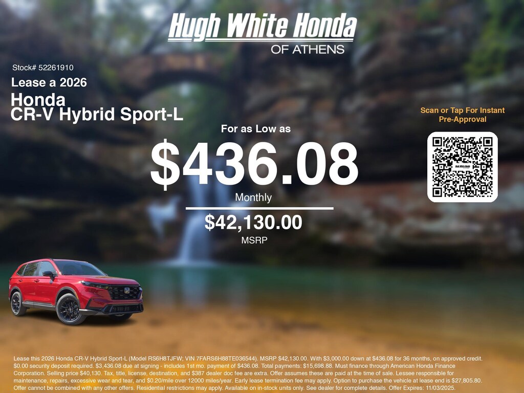 Disclaimer: Lease this 2026 Honda CR-V Hybrid Sport-L (Model RS6H8TJFW; VIN 7FARS6H88TE036544). MSRP $42,130.00. With $3,000.00 down at $436.08 for 36 months, on approved credit. $0.00 security deposit required. $3,436.08 due at signing - includes 1st mo. payment of $436.08. Total payments: $15,698.88. Must finance through American Honda Finance Corporation. Selling price $40,130. Tax, title, license, destination, and $387 dealer doc fee are extra. Offer assumes these are paid at the time of sale. Lessee responsible for maintenance, repairs, excessive wear and tear, and $0.20/mile over 12000 miles/year. Early lease termination fee may apply. Option to purchase the vehicle at lease end is $27,805.80. Offer cannot be combined with any other offers. Residential restrictions may apply. Available on in-stock units only. See dealer for complete details. Offer Expires: 11/03/2025.