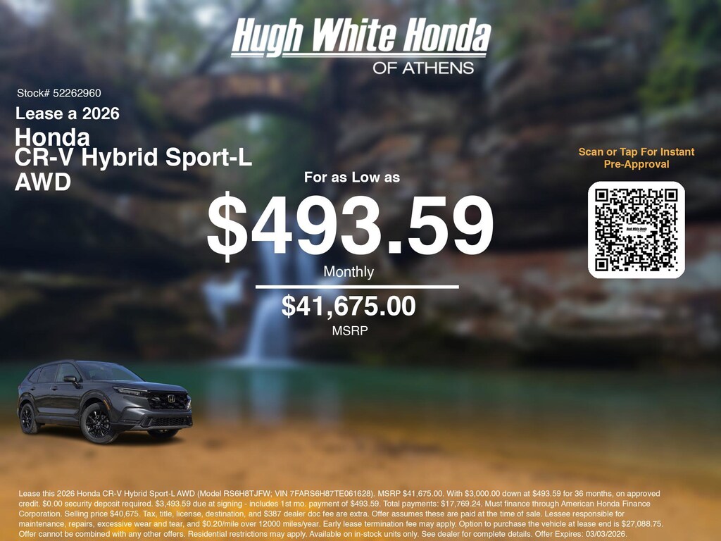 Disclaimer: Lease this 2026 Honda CR-V Hybrid Sport-L AWD (Model RS6H8TJFW; VIN 7FARS6H87TE061628). MSRP $41,675.00. With $3,000.00 down at $493.59 for 36 months, on approved credit. $0.00 security deposit required. $3,493.59 due at signing - includes 1st mo. payment of $493.59. Total payments: $17,769.24. Must finance through American Honda Finance Corporation. Selling price $40,675. Tax, title, license, destination, and $387 dealer doc fee are extra. Offer assumes these are paid at the time of sale. Lessee responsible for maintenance, repairs, excessive wear and tear, and $0.20/mile over 12000 miles/year. Early lease termination fee may apply. Option to purchase the vehicle at lease end is $27,088.75. Offer cannot be combined with any other offers. Residential restrictions may apply. Available on in-stock units only. See dealer for complete details. Offer Expires: 03/03/2026.