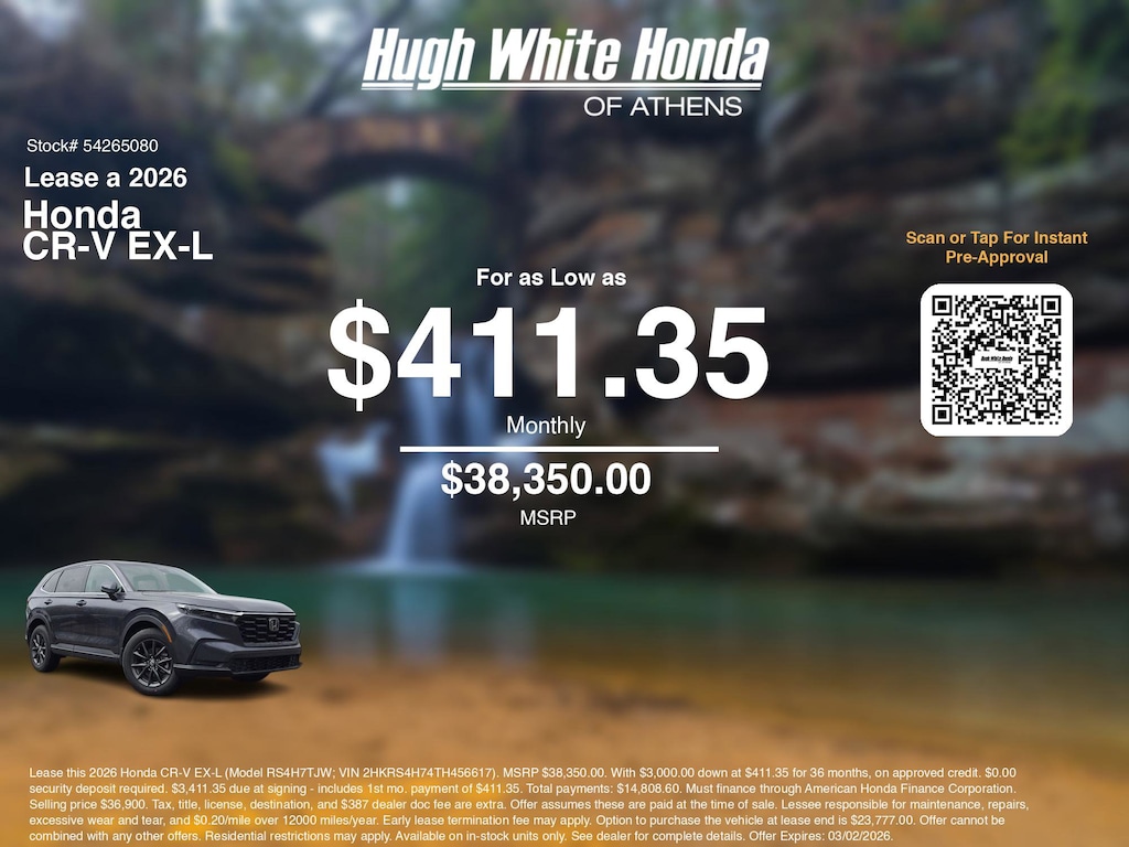 If you're ready to lease a new Honda near Athens, Nelsonville, Logan, and Parkersburg, Hugh White Honda of Athens is thrilled to offer you a competitive lease offer on this 2026 Honda CR-V EX-L. Here is how the monthly payment of $411.35 is calculated for well qualified buyers shopping Hugh White Honda of Athens with Tier 1 credit: