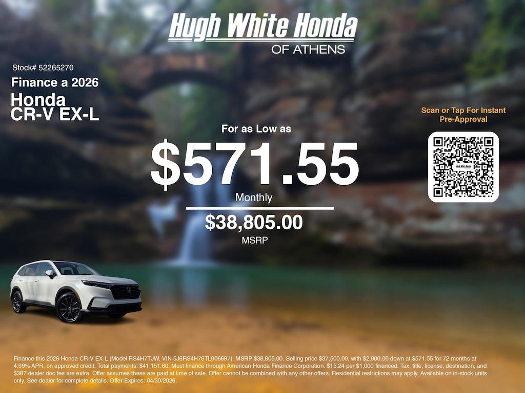 If you're ready to finance a new Honda near Athens, Nelsonville, Logan, and Parkersburg, Hugh White Honda of Athens is thrilled to offer you a competitive finance offer on this 2026 Honda CR-V EX-L. Hereâs how the monthly payment of $571.55 is calculated for well qualified buyers shopping Hugh White Honda of Athens with Tier 1 credit:
