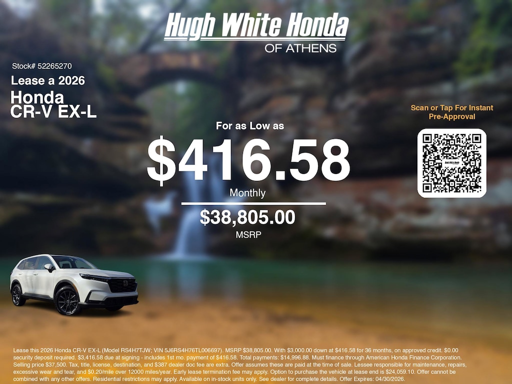 If you're ready to lease a new Honda near Athens, Nelsonville, Logan, and Parkersburg, Hugh White Honda of Athens is thrilled to offer you a competitive lease offer on this 2026 Honda CR-V EX-L. Here is how the monthly payment of $416.58 is calculated for well qualified buyers shopping Hugh White Honda of Athens with Tier 1 credit: