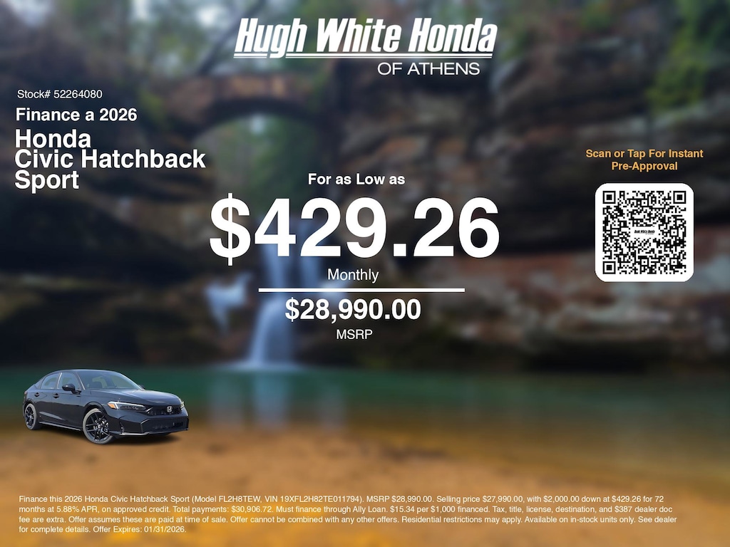 Our New Honda Dealership in Athens, OH: Call Hugh White Honda Athens today at (844) 859-8630 TO SCHEDULE YOUR TEST DRIVE of this 2026 Honda Civic Hatchback Sport! Hugh White Honda Athens serves Athens, OH. You can also visit us at, 250 Athens Road. Athens, OH 45701 to check it out in person!