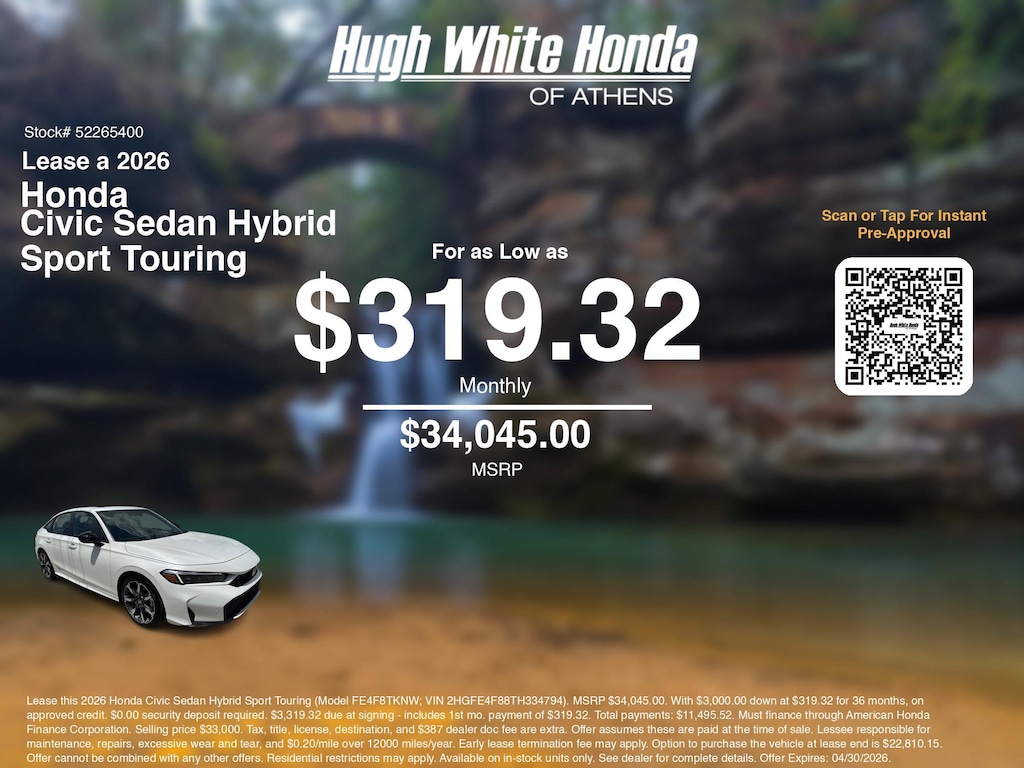 Disclaimer: Lease this 2026 Honda Civic Sedan Hybrid Sport Touring (Model FE4F8TKNW; VIN 2HGFE4F88TH334794). MSRP $34,045.00. With $3,000.00 down at $319.32 for 36 months, on approved credit. $0.00 security deposit required. $3,319.32 due at signing - includes 1st mo. payment of $319.32. Total payments: $11,495.52. Must finance through American Honda Finance Corporation. Selling price $33,000. Tax, title, license, destination, and $387 dealer doc fee are extra. Offer assumes these are paid at the time of sale. Lessee responsible for maintenance, repairs, excessive wear and tear, and $0.20/mile over 12000 miles/year. Early lease termination fee may apply. Option to purchase the vehicle at lease end is $22,810.15. Offer cannot be combined with any other offers. Residential restrictions may apply. Available on in-stock units only. See dealer for complete details. Offer Expires: 04/30/2026.