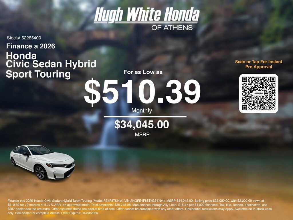Calculate car payment options using our car monthly payment calculator to explore this and other Honda finance offers that leverage the benefits of Honda Financial Services, along with current Honda Civic Sedan Hybrid Sport Touring specials and incentives available. Our car payment estimator can help you budget for your perfect vehicle. Plus, we have 4 other Civic Sedan Hybrid Sport Touring options for Athens's best selection. Call or visit us today to discuss car payment options that allow you to drive home this stunning 2026 Honda Civic Sedan Hybrid, with finance options available near Athens. These Honda finance specials end 4/30/2026