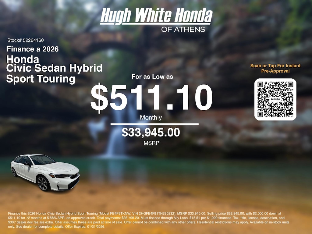 Disclaimer: Finance this 2026 Honda Civic Sedan Hybrid Sport Touring (Model FE4F8TKNW, VIN 2HGFE4F81TH330232). MSRP $33,945.00. Selling price $32,945.00, with $2,000.00 down at $511.10 for 72 months at 5.88% APR, on approved credit. Total payments: $36,799.20. Must finance through Ally Loan. $15.51 per $1,000 financed. Tax, title, license, destination, and $387 dealer doc fee are extra. Offer assumes these are paid at time of sale. Offer cannot be combined with any other offers. Residential restrictions may apply. Available on in-stock units only. See dealer for complete details. Offer Expires: 01/31/2026.