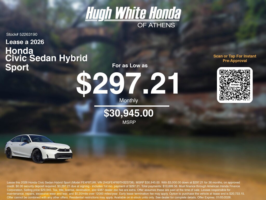 If you're ready to lease a new Honda near Athens, Nelsonville, Logan, and Parkersburg, Hugh White Honda of Athens is thrilled to offer you a competitive lease offer on this 2026 Honda Civic Sedan Hybrid Sport. Here is how the monthly payment of $297.21 is calculated for well qualified buyers shopping Hugh White Honda of Athens with Tier 1 credit:
