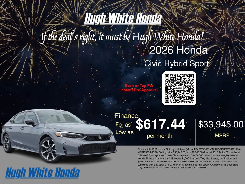 Disclaimer: Finance this 2026 Honda Civic Hybrid Sport (Model FE4F8TKNW, VIN 2HGFE4F80TH322459). MSRP $33,945.00. Selling price $33,945.00, with $2,000.00 down at $617.44 for 60 months at 5.99% APR, on approved credit. Total payments: $37,046.40. Must finance through American Honda Finance Corporation. $18.19 per $1,000 financed. Tax, title, license, destination, and $387 dealer doc fee are extra. Offer assumes these are paid at time of sale. Offer cannot be combined with any other offers. Residential restrictions may apply. Available on in-stock units only. See dealer for complete details. Offer Expires: 01/05/2026.