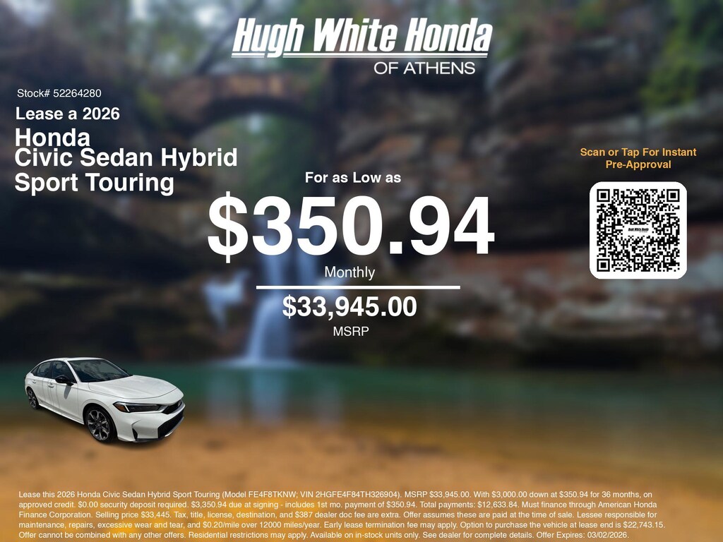 If you're ready to lease a new Honda near Athens, Nelsonville, Logan, and Parkersburg, Hugh White Honda of Athens is thrilled to offer you a competitive lease offer on this 2026 Honda Civic Sedan Hybrid Sport Touring. Here is how the monthly payment of $350.94 is calculated for well qualified buyers shopping Hugh White Honda of Athens with Tier 1 credit: