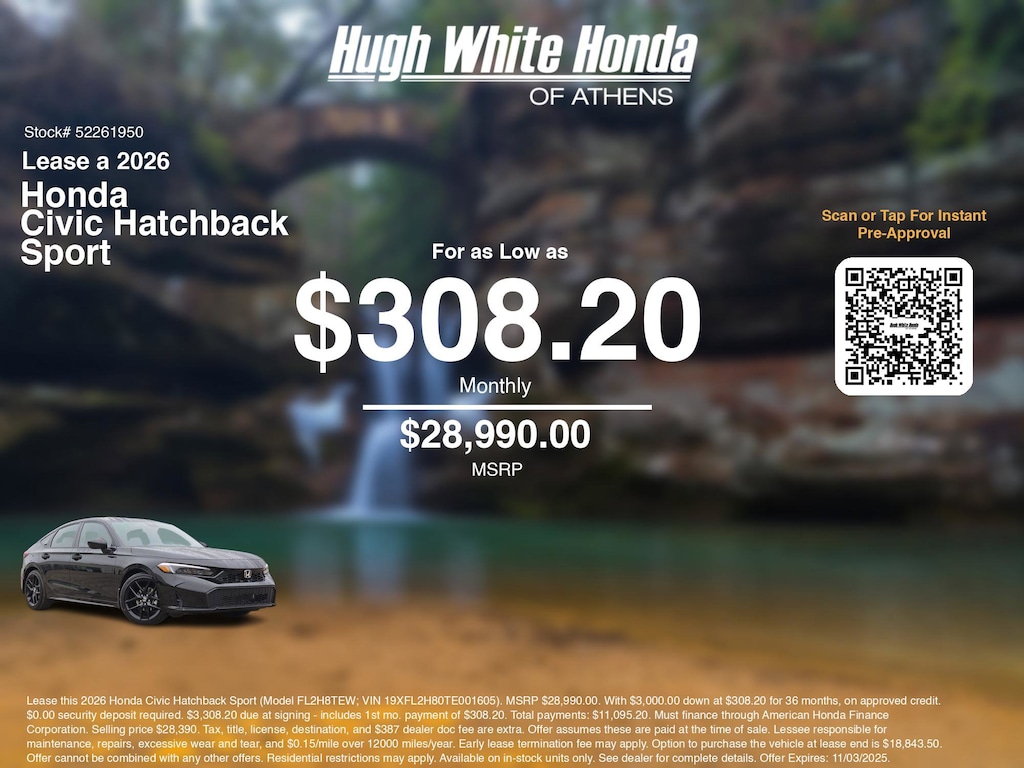 Disclaimer: Lease this 2026 Honda Civic Hatchback Sport (Model FL2H8TEW; VIN 19XFL2H80TE001605). MSRP $28,990.00. With $3,000.00 down at $308.20 for 36 months, on approved credit. $0.00 security deposit required. $3,308.20 due at signing - includes 1st mo. payment of $308.20. Total payments: $11,095.20. Must finance through American Honda Finance Corporation. Selling price $28,390. Tax, title, license, destination, and $387 dealer doc fee are extra. Offer assumes these are paid at the time of sale. Lessee responsible for maintenance, repairs, excessive wear and tear, and $0.15/mile over 12000 miles/year. Early lease termination fee may apply. Option to purchase the vehicle at lease end is $18,843.50. Offer cannot be combined with any other offers. Residential restrictions may apply. Available on in-stock units only. See dealer for complete details. Offer Expires: 11/03/2025.