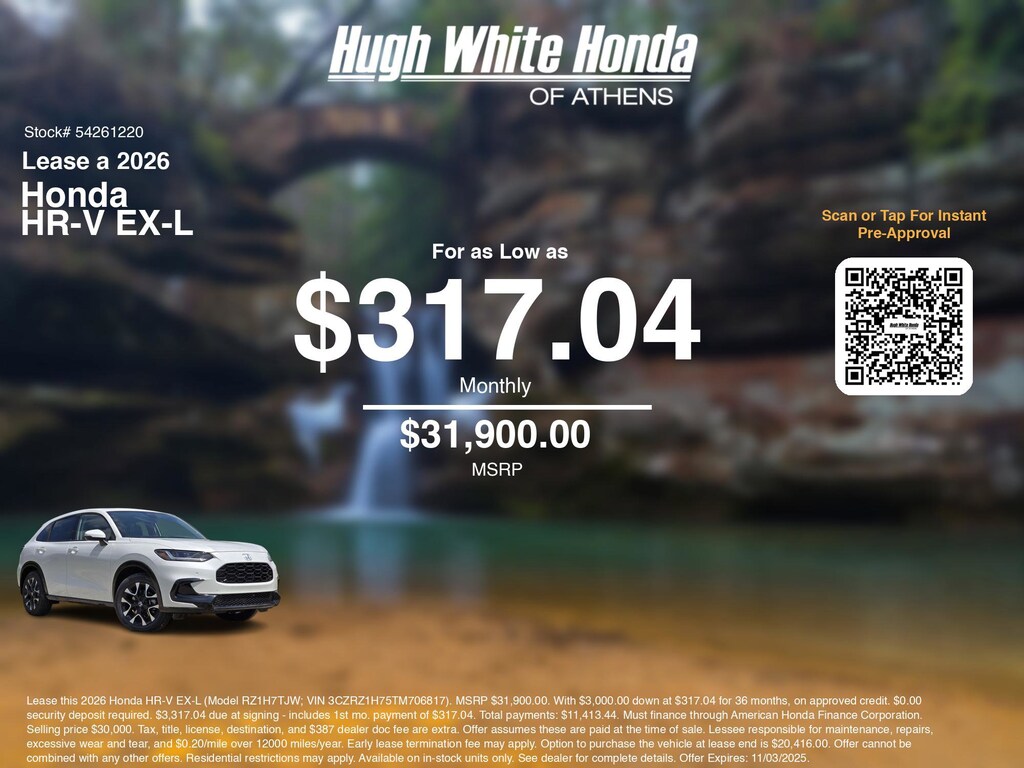 Disclaimer: Lease this 2026 Honda HR-V EX-L (Model RZ1H7TJW; VIN 3CZRZ1H75TM706817). MSRP $31,900.00. With $3,000.00 down at $317.04 for 36 months, on approved credit. $0.00 security deposit required. $3,317.04 due at signing - includes 1st mo. payment of $317.04. Total payments: $11,413.44. Must finance through American Honda Finance Corporation. Selling price $30,000. Tax, title, license, destination, and $387 dealer doc fee are extra. Offer assumes these are paid at the time of sale. Lessee responsible for maintenance, repairs, excessive wear and tear, and $0.20/mile over 12000 miles/year. Early lease termination fee may apply. Option to purchase the vehicle at lease end is $20,416.00. Offer cannot be combined with any other offers. Residential restrictions may apply. Available on in-stock units only. See dealer for complete details. Offer Expires: 11/03/2025.