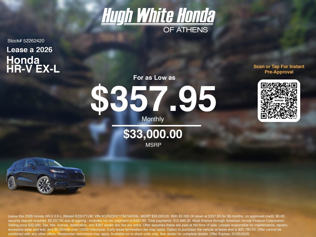 Disclaimer: Lease this 2026 Honda HR-V EX-L (Model RZ2H7TJW; VIN 3CZRZ2H71TM734359). MSRP $33,000.00. With $3,000.00 down at $357.95 for 36 months, on approved credit. $0.00 security deposit required. $3,357.95 due at signing - includes 1st mo. payment of $357.95. Total payments: $12,886.20. Must finance through American Honda Finance Corporation. Selling price $32,000. Tax, title, license, destination, and $387 dealer doc fee are extra. Offer assumes these are paid at the time of sale. Lessee responsible for maintenance, repairs, excessive wear and tear, and $0.20/mile over 12000 miles/year. Early lease termination fee may apply. Option to purchase the vehicle at lease end is $20,790.00. Offer cannot be combined with any other offers. Residential restrictions may apply. Available on in-stock units only. See dealer for complete details. Offer Expires: 01/05/2026.