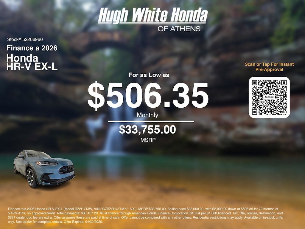 Disclaimer: Finance this 2026 Honda HR-V EX-L (Model RZ2H7TJW, VIN 3CZRZ2H75TM771690). MSRP $33,755.00. Selling price $33,000.00, with $2,000.00 down at $506.35 for 72 months at 5.49% APR, on approved credit. Total payments: $36,457.20. Must finance through American Honda Finance Corporation. $15.34 per $1,000 financed. Tax, title, license, destination, and $387 dealer doc fee are extra. Offer assumes these are paid at time of sale. Offer cannot be combined with any other offers. Residential restrictions may apply. Available on in-stock units only. See dealer for complete details. Offer Expires: 04/30/2026.