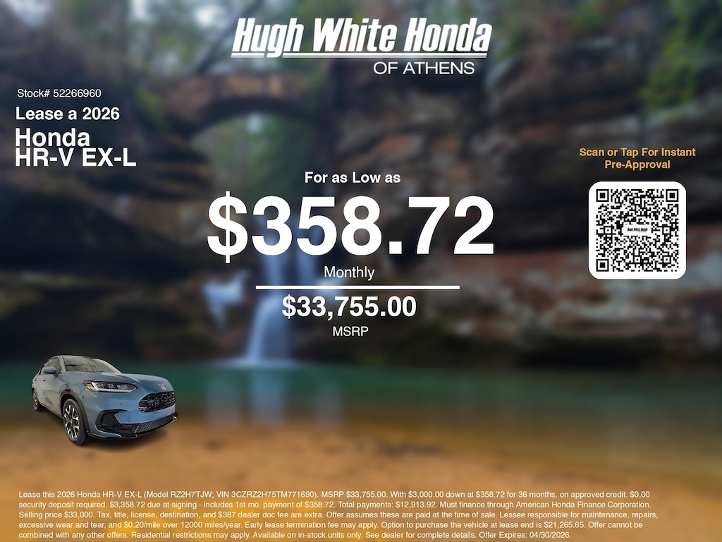 Disclaimer: Lease this 2026 Honda HR-V EX-L (Model RZ2H7TJW; VIN 3CZRZ2H75TM771690). MSRP $33,755.00. With $3,000.00 down at $358.72 for 36 months, on approved credit. $0.00 security deposit required. $3,358.72 due at signing - includes 1st mo. payment of $358.72. Total payments: $12,913.92. Must finance through American Honda Finance Corporation. Selling price $33,000. Tax, title, license, destination, and $387 dealer doc fee are extra. Offer assumes these are paid at the time of sale. Lessee responsible for maintenance, repairs, excessive wear and tear, and $0.20/mile over 12000 miles/year. Early lease termination fee may apply. Option to purchase the vehicle at lease end is $21,265.65. Offer cannot be combined with any other offers. Residential restrictions may apply. Available on in-stock units only. See dealer for complete details. Offer Expires: 04/30/2026.