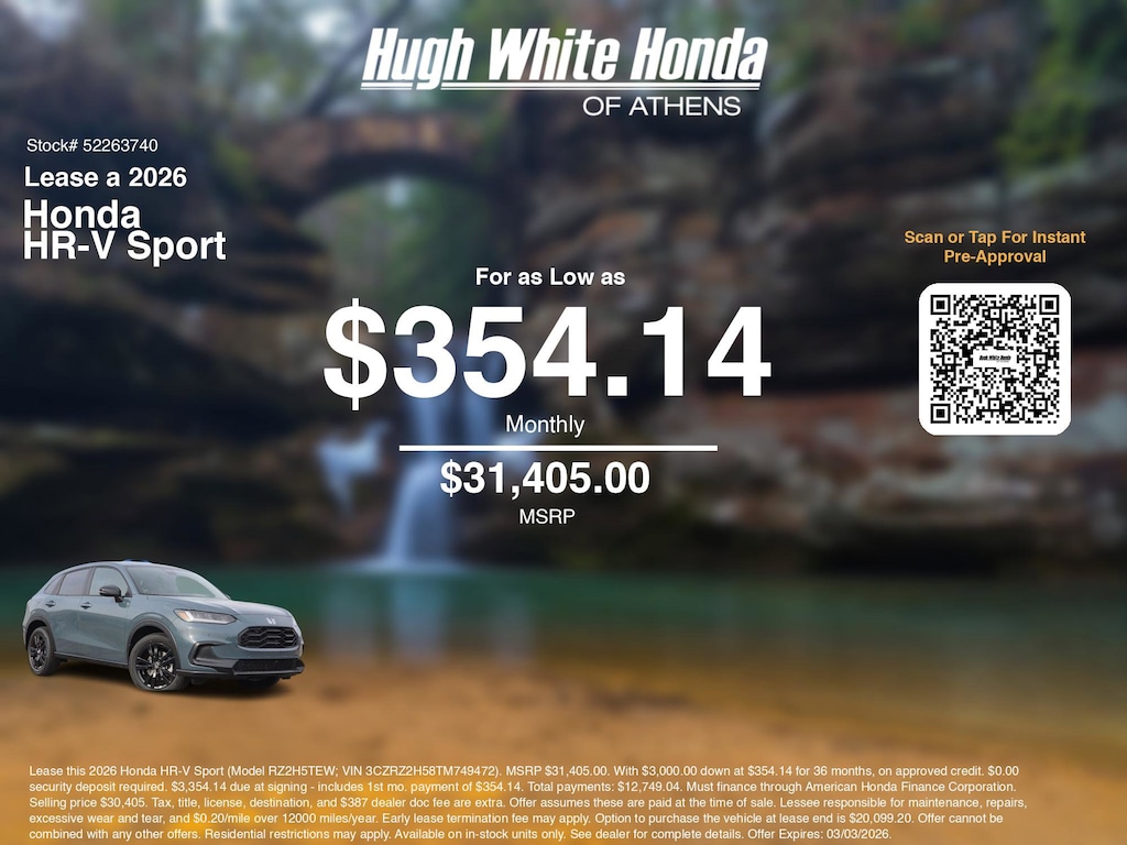 Disclaimer: Lease this 2026 Honda HR-V Sport (Model RZ2H5TEW; VIN 3CZRZ2H58TM749472). MSRP $31,405.00. With $3,000.00 down at $354.14 for 36 months, on approved credit. $0.00 security deposit required. $3,354.14 due at signing - includes 1st mo. payment of $354.14. Total payments: $12,749.04. Must finance through American Honda Finance Corporation. Selling price $30,405. Tax, title, license, destination, and $387 dealer doc fee are extra. Offer assumes these are paid at the time of sale. Lessee responsible for maintenance, repairs, excessive wear and tear, and $0.20/mile over 12000 miles/year. Early lease termination fee may apply. Option to purchase the vehicle at lease end is $20,099.20. Offer cannot be combined with any other offers. Residential restrictions may apply. Available on in-stock units only. See dealer for complete details. Offer Expires: 03/03/2026.