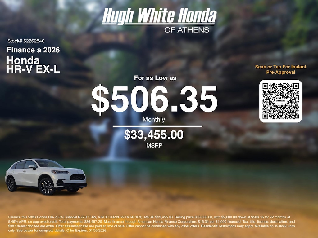Calculate car payment options using our car monthly payment calculator to explore this and other Honda finance offers that leverage the benefits of Honda Financial Services, along with current Honda HR-V EX-L specials and incentives available. Our car payment estimator can help you budget for your perfect vehicle. Plus, we have 7 other HR-V EX-L options for Athens's best selection. Call or visit us today to discuss car payment options that allow you to drive home this stunning 2026 Honda HR-V, with finance options available near Athens. These Honda finance specials end 1/5/2026