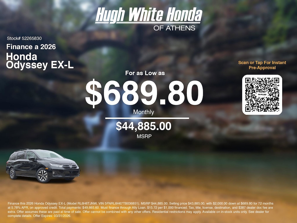 If you're ready to finance a new Honda near Athens, Nelsonville, Logan, and Parkersburg, Hugh White Honda of Athens is thrilled to offer you a competitive finance offer on this 2026 Honda Odyssey EX-L. Hereâs how the monthly payment of $689.80 is calculated for well qualified buyers shopping Hugh White Honda of Athens with Tier 1 credit: