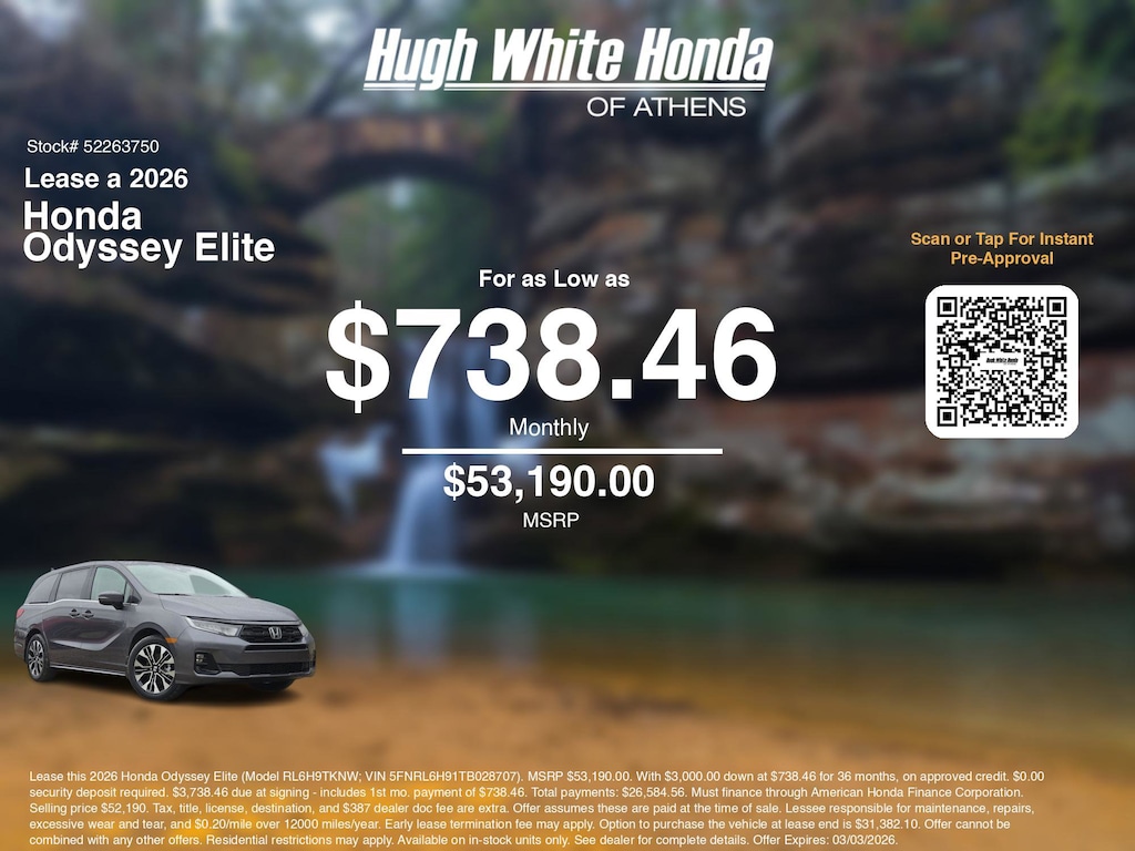 Disclaimer: Lease this 2026 Honda Odyssey Elite (Model RL6H9TKNW; VIN 5FNRL6H91TB028707). MSRP $53,190.00. With $3,000.00 down at $738.46 for 36 months, on approved credit. $0.00 security deposit required. $3,738.46 due at signing - includes 1st mo. payment of $738.46. Total payments: $26,584.56. Must finance through American Honda Finance Corporation. Selling price $52,190. Tax, title, license, destination, and $387 dealer doc fee are extra. Offer assumes these are paid at the time of sale. Lessee responsible for maintenance, repairs, excessive wear and tear, and $0.20/mile over 12000 miles/year. Early lease termination fee may apply. Option to purchase the vehicle at lease end is $31,382.10. Offer cannot be combined with any other offers. Residential restrictions may apply. Available on in-stock units only. See dealer for complete details. Offer Expires: 03/03/2026.