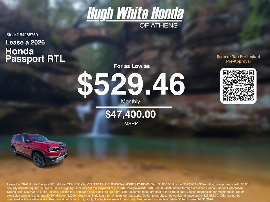 Disclaimer: Lease this 2026 Honda Passport RTL (Model YF9H3TGXW; VIN 5FNYF9H38TB045794). MSRP $47,400.00. With $3,000.00 down at $529.46 for 36 months, on approved credit. $0.00 security deposit required. $3,529.46 due at signing - includes 1st mo. payment of $529.46. Total payments: $19,060.56. Must finance through American Honda Finance Corporation. Selling price $45,400. Tax, title, license, destination, and $387 dealer doc fee are extra. Offer assumes these are paid at the time of sale. Lessee responsible for maintenance, repairs, excessive wear and tear, and $0.20/mile over 12000 miles/year. Early lease termination fee may apply. Option to purchase the vehicle at lease end is $29,862.00. Offer cannot be combined with any other offers. Residential restrictions may apply. Available on in-stock units only. See dealer for complete details. Offer Expires: 04/30/2026.