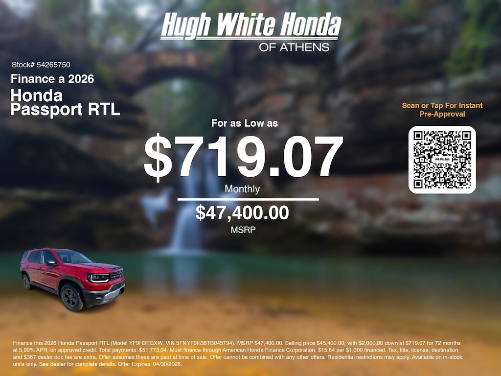 Disclaimer: Finance this 2026 Honda Passport RTL (Model YF9H3TGXW, VIN 5FNYF9H38TB045794). MSRP $47,400.00. Selling price $45,400.00, with $2,000.00 down at $719.07 for 72 months at 5.99% APR, on approved credit. Total payments: $51,773.04. Must finance through American Honda Finance Corporation. $15.84 per $1,000 financed. Tax, title, license, destination, and $387 dealer doc fee are extra. Offer assumes these are paid at time of sale. Offer cannot be combined with any other offers. Residential restrictions may apply. Available on in-stock units only. See dealer for complete details. Offer Expires: 04/30/2026.