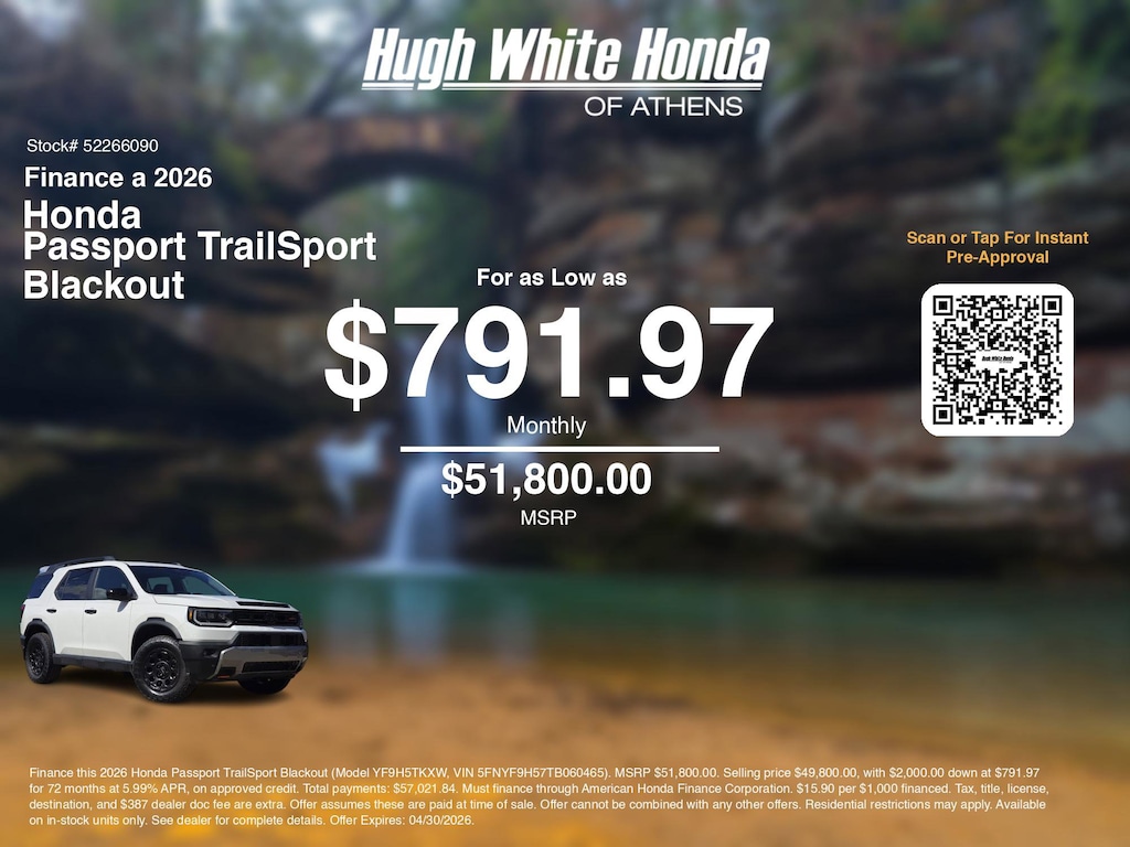 Disclaimer: Finance this 2026 Honda Passport TrailSport Blackout (Model YF9H5TKXW, VIN 5FNYF9H57TB060465). MSRP $51,800.00. Selling price $49,800.00, with $2,000.00 down at $791.97 for 72 months at 5.99% APR, on approved credit. Total payments: $57,021.84. Must finance through American Honda Finance Corporation. $15.90 per $1,000 financed. Tax, title, license, destination, and $387 dealer doc fee are extra. Offer assumes these are paid at time of sale. Offer cannot be combined with any other offers. Residential restrictions may apply. Available on in-stock units only. See dealer for complete details. Offer Expires: 04/30/2026.