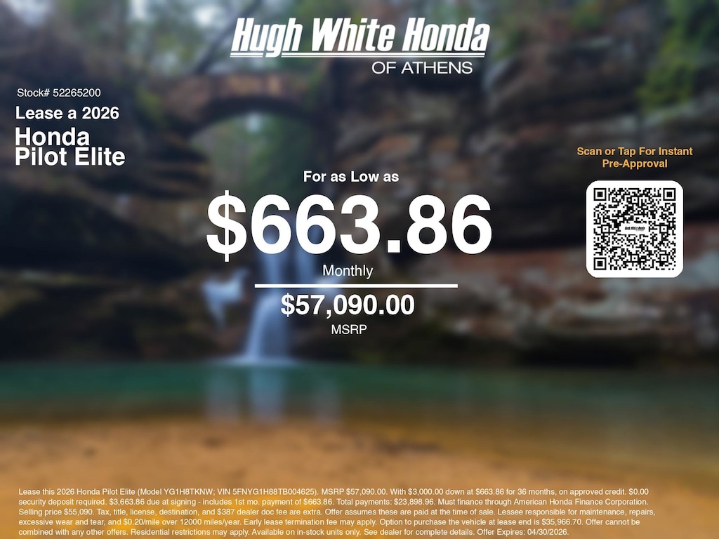Disclaimer: Lease this 2026 Honda Pilot Elite (Model YG1H8TKNW; VIN 5FNYG1H88TB004625). MSRP $57,090.00. With $3,000.00 down at $663.86 for 36 months, on approved credit. $0.00 security deposit required. $3,663.86 due at signing - includes 1st mo. payment of $663.86. Total payments: $23,898.96. Must finance through American Honda Finance Corporation. Selling price $55,090. Tax, title, license, destination, and $387 dealer doc fee are extra. Offer assumes these are paid at the time of sale. Lessee responsible for maintenance, repairs, excessive wear and tear, and $0.20/mile over 12000 miles/year. Early lease termination fee may apply. Option to purchase the vehicle at lease end is $35,966.70. Offer cannot be combined with any other offers. Residential restrictions may apply. Available on in-stock units only. See dealer for complete details. Offer Expires: 04/30/2026.