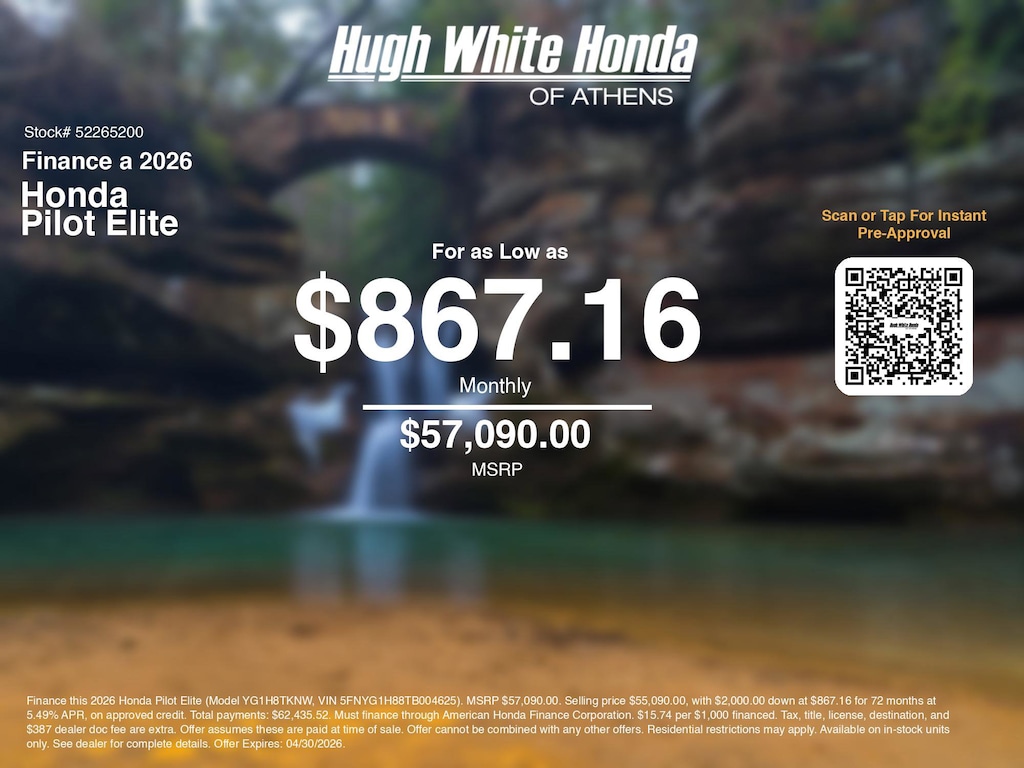 Disclaimer: Finance this 2026 Honda Pilot Elite (Model YG1H8TKNW, VIN 5FNYG1H88TB004625). MSRP $57,090.00. Selling price $55,090.00, with $2,000.00 down at $867.16 for 72 months at 5.49% APR, on approved credit. Total payments: $62,435.52. Must finance through American Honda Finance Corporation. $15.74 per $1,000 financed. Tax, title, license, destination, and $387 dealer doc fee are extra. Offer assumes these are paid at time of sale. Offer cannot be combined with any other offers. Residential restrictions may apply. Available on in-stock units only. See dealer for complete details. Offer Expires: 04/30/2026.