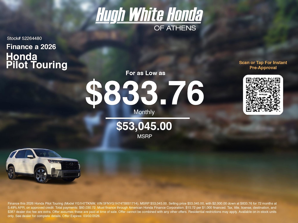 Disclaimer: Finance this 2026 Honda Pilot Touring (Model YG1H7TKNW, VIN 5FNYG1H74TB001714). MSRP $53,045.00. Selling price $53,045.00, with $2,000.00 down at $833.76 for 72 months at 5.49% APR, on approved credit. Total payments: $60,030.72. Must finance through American Honda Finance Corporation. $15.72 per $1,000 financed. Tax, title, license, destination, and $387 dealer doc fee are extra. Offer assumes these are paid at time of sale. Offer cannot be combined with any other offers. Residential restrictions may apply. Available on in-stock units only. See dealer for complete details. Offer Expires: 03/02/2026.