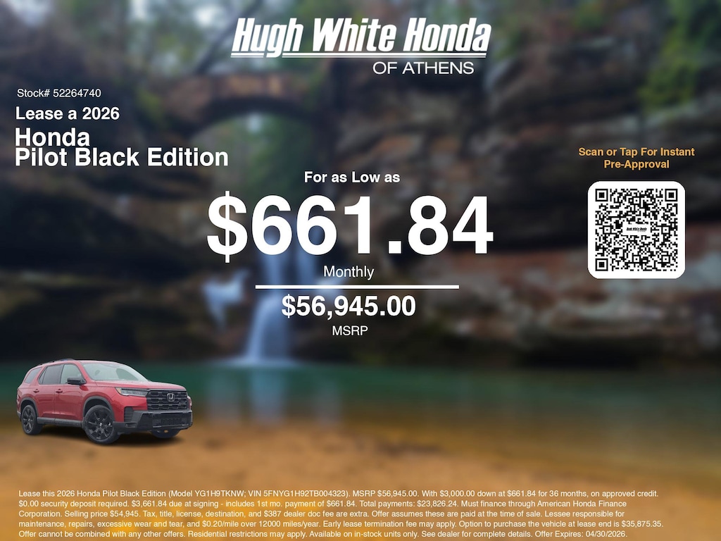 Disclaimer: Lease this 2026 Honda Pilot Black Edition (Model YG1H9TKNW; VIN 5FNYG1H92TB004323). MSRP $56,945.00. With $3,000.00 down at $661.84 for 36 months, on approved credit. $0.00 security deposit required. $3,661.84 due at signing - includes 1st mo. payment of $661.84. Total payments: $23,826.24. Must finance through American Honda Finance Corporation. Selling price $54,945. Tax, title, license, destination, and $387 dealer doc fee are extra. Offer assumes these are paid at the time of sale. Lessee responsible for maintenance, repairs, excessive wear and tear, and $0.20/mile over 12000 miles/year. Early lease termination fee may apply. Option to purchase the vehicle at lease end is $35,875.35. Offer cannot be combined with any other offers. Residential restrictions may apply. Available on in-stock units only. See dealer for complete details. Offer Expires: 04/30/2026.