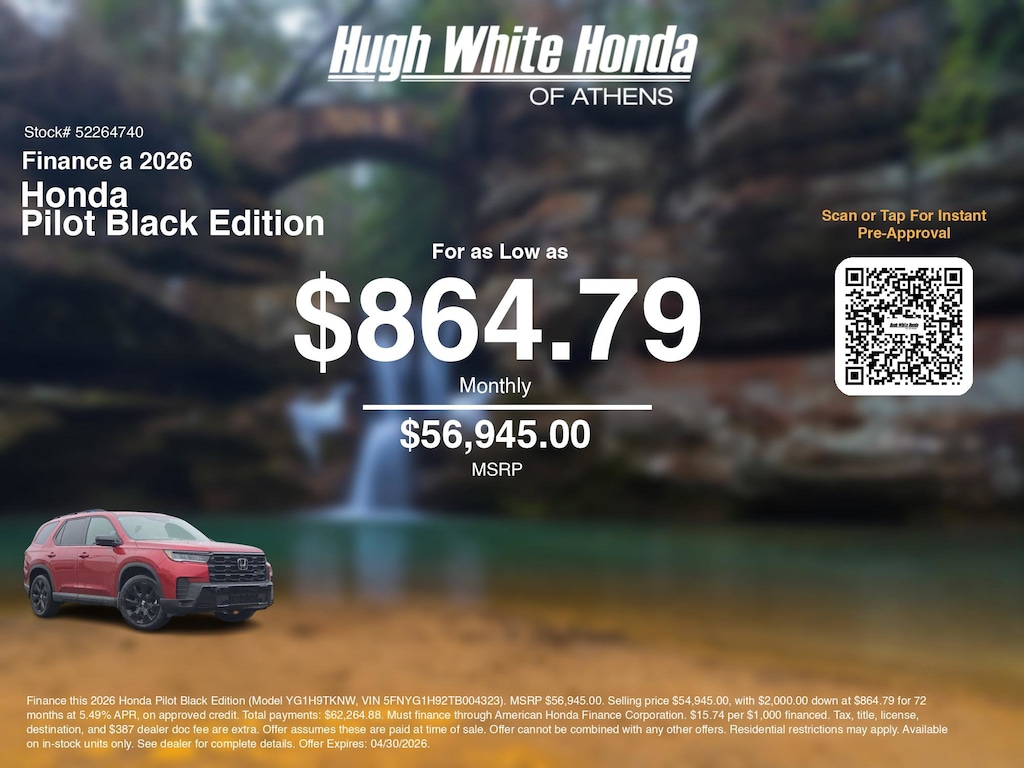Disclaimer: Finance this 2026 Honda Pilot Black Edition (Model YG1H9TKNW, VIN 5FNYG1H92TB004323). MSRP $56,945.00. Selling price $54,945.00, with $2,000.00 down at $864.79 for 72 months at 5.49% APR, on approved credit. Total payments: $62,264.88. Must finance through American Honda Finance Corporation. $15.74 per $1,000 financed. Tax, title, license, destination, and $387 dealer doc fee are extra. Offer assumes these are paid at time of sale. Offer cannot be combined with any other offers. Residential restrictions may apply. Available on in-stock units only. See dealer for complete details. Offer Expires: 04/30/2026.