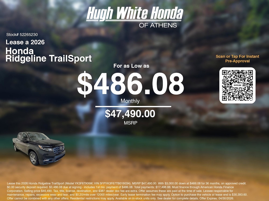 Disclaimer: Lease this 2026 Honda Ridgeline TrailSport (Model YK3F6TKNW; VIN 5FPYK3F67TB018034). MSRP $47,490.00. With $3,000.00 down at $486.08 for 36 months, on approved credit. $0.00 security deposit required. $3,486.08 due at signing - includes 1st mo. payment of $486.08. Total payments: $17,498.88. Must finance through American Honda Finance Corporation. Selling price $46,490. Tax, title, license, destination, and $387 dealer doc fee are extra. Offer assumes these are paid at the time of sale. Lessee responsible for maintenance, repairs, excessive wear and tear, and $0.20/mile over 12000 miles/year. Early lease termination fee may apply. Option to purchase the vehicle at lease end is $30,393.60. Offer cannot be combined with any other offers. Residential restrictions may apply. Available on in-stock units only. See dealer for complete details. Offer Expires: 04/30/2026.