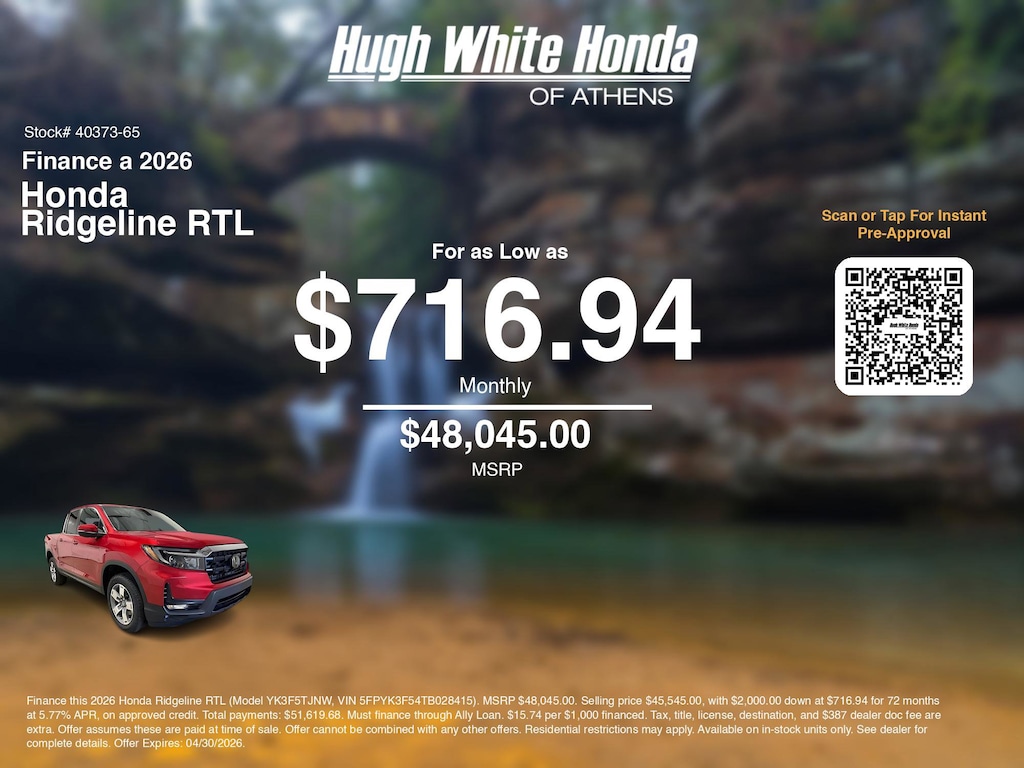 Disclaimer: Finance this 2026 Honda Ridgeline RTL (Model YK3F5TJNW, VIN 5FPYK3F54TB028415). MSRP $48,045.00. Selling price $45,545.00, with $2,000.00 down at $716.94 for 72 months at 5.77% APR, on approved credit. Total payments: $51,619.68. Must finance through Ally Loan. $15.74 per $1,000 financed. Tax, title, license, destination, and $387 dealer doc fee are extra. Offer assumes these are paid at time of sale. Offer cannot be combined with any other offers. Residential restrictions may apply. Available on in-stock units only. See dealer for complete details. Offer Expires: 04/30/2026.