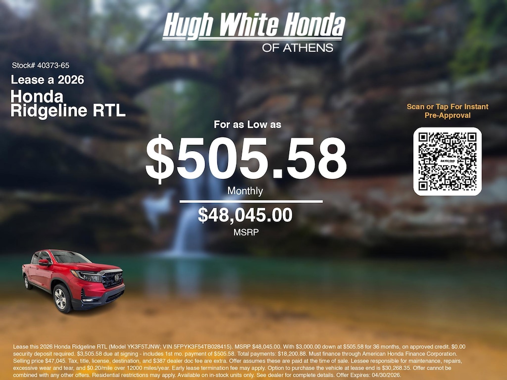 Disclaimer: Lease this 2026 Honda Ridgeline RTL (Model YK3F5TJNW; VIN 5FPYK3F54TB028415). MSRP $48,045.00. With $3,000.00 down at $505.58 for 36 months, on approved credit. $0.00 security deposit required. $3,505.58 due at signing - includes 1st mo. payment of $505.58. Total payments: $18,200.88. Must finance through American Honda Finance Corporation. Selling price $47,045. Tax, title, license, destination, and $387 dealer doc fee are extra. Offer assumes these are paid at the time of sale. Lessee responsible for maintenance, repairs, excessive wear and tear, and $0.20/mile over 12000 miles/year. Early lease termination fee may apply. Option to purchase the vehicle at lease end is $30,268.35. Offer cannot be combined with any other offers. Residential restrictions may apply. Available on in-stock units only. See dealer for complete details. Offer Expires: 04/30/2026.